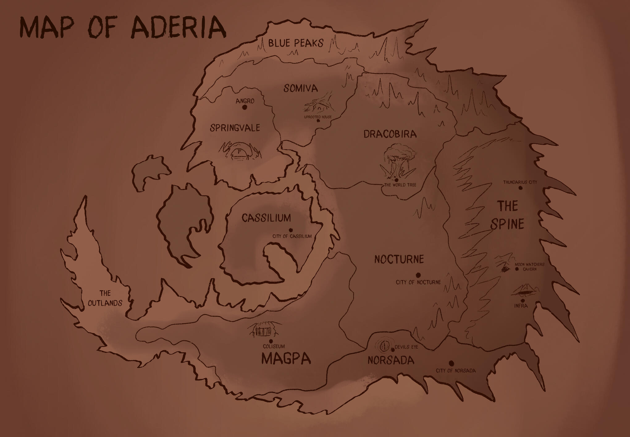 On the outskirts of Aderia, lies a place known by bloody wars, mysterious creatures and death. A land shrouded in many myths and mysteries. This is the land that Akal banished the dragons too 700 years ago.Humans and dragonborn alike are forbidden to travel here, in fear of causing further tensions between manfolk and dragonkind. Little is known about the spine, however there are rumors of it gaining its name from the corpse of a fallen god. The council says this is falls, and it is actually because the geography looks like the spine of a beast.