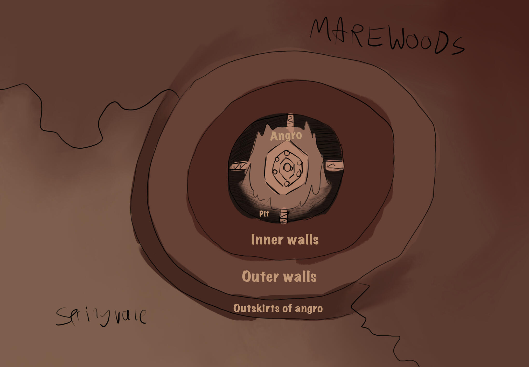 A dense forest near the spine that is infested with wild beasts. It gets its name due to the city being covered in thick trees and swampy terrain.